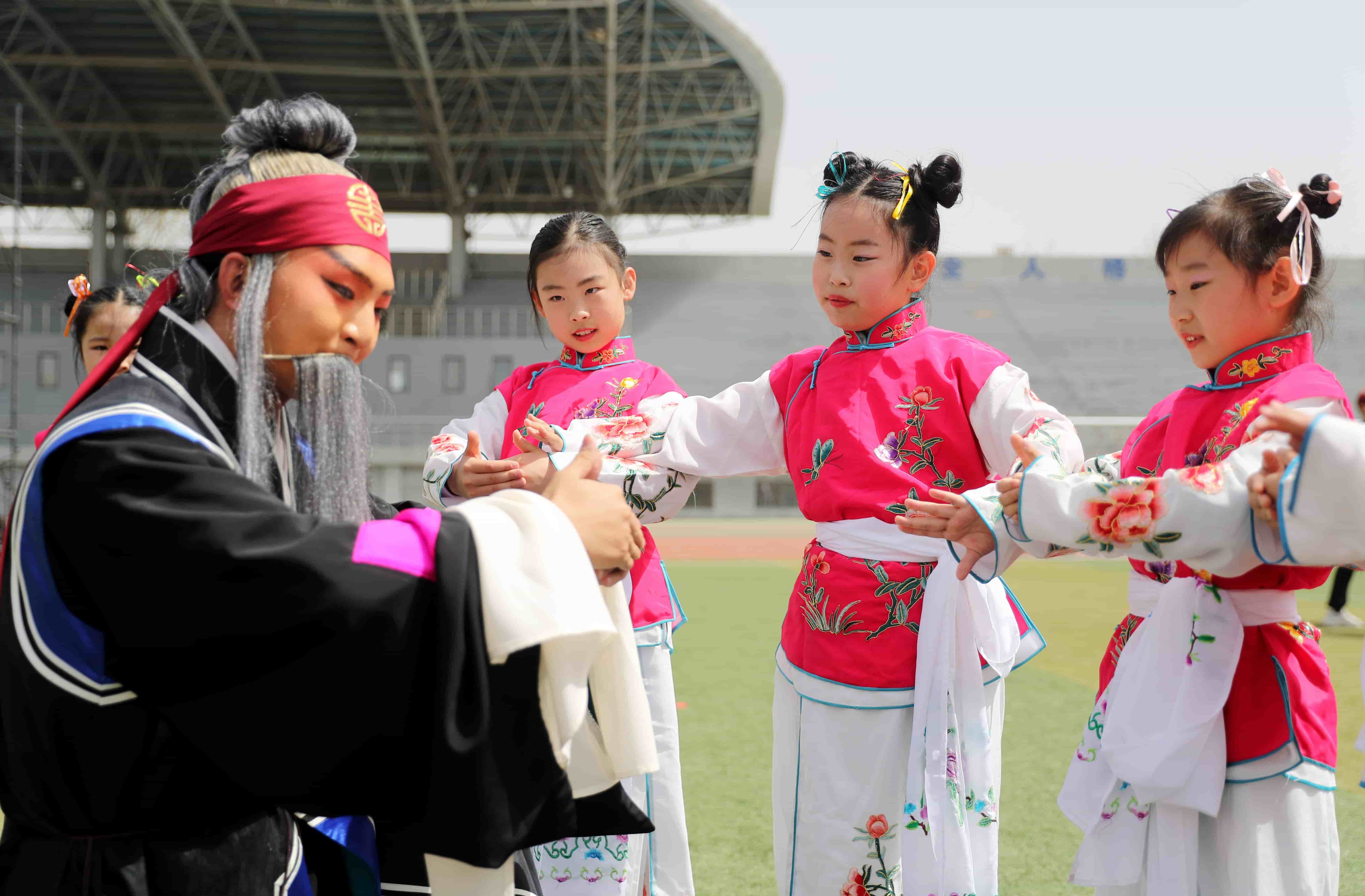 4月15日,山東青島,中國石油大學(華東)韻遠京劇隊的同學們聯(lián)合青島西海岸新區(qū)珠江路小學的小學生在大學校園里上演了一堂生動的戲曲普及課。 張進剛 攝