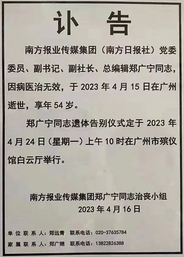 據(jù)南方報業(yè)傳媒集團發(fā)布的訃告,南方報業(yè)傳媒集團(南方日報社)黨委委員、副書記、副社長、總編輯鄭廣寧同志,因病醫(yī)治無效,于2023年4月15日在廣州逝世,享年54歲。
