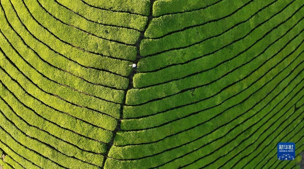 4月16日,茶農(nóng)在鶴峰縣走馬鎮(zhèn)木耳山茶園采茶(無人機(jī)照片)。