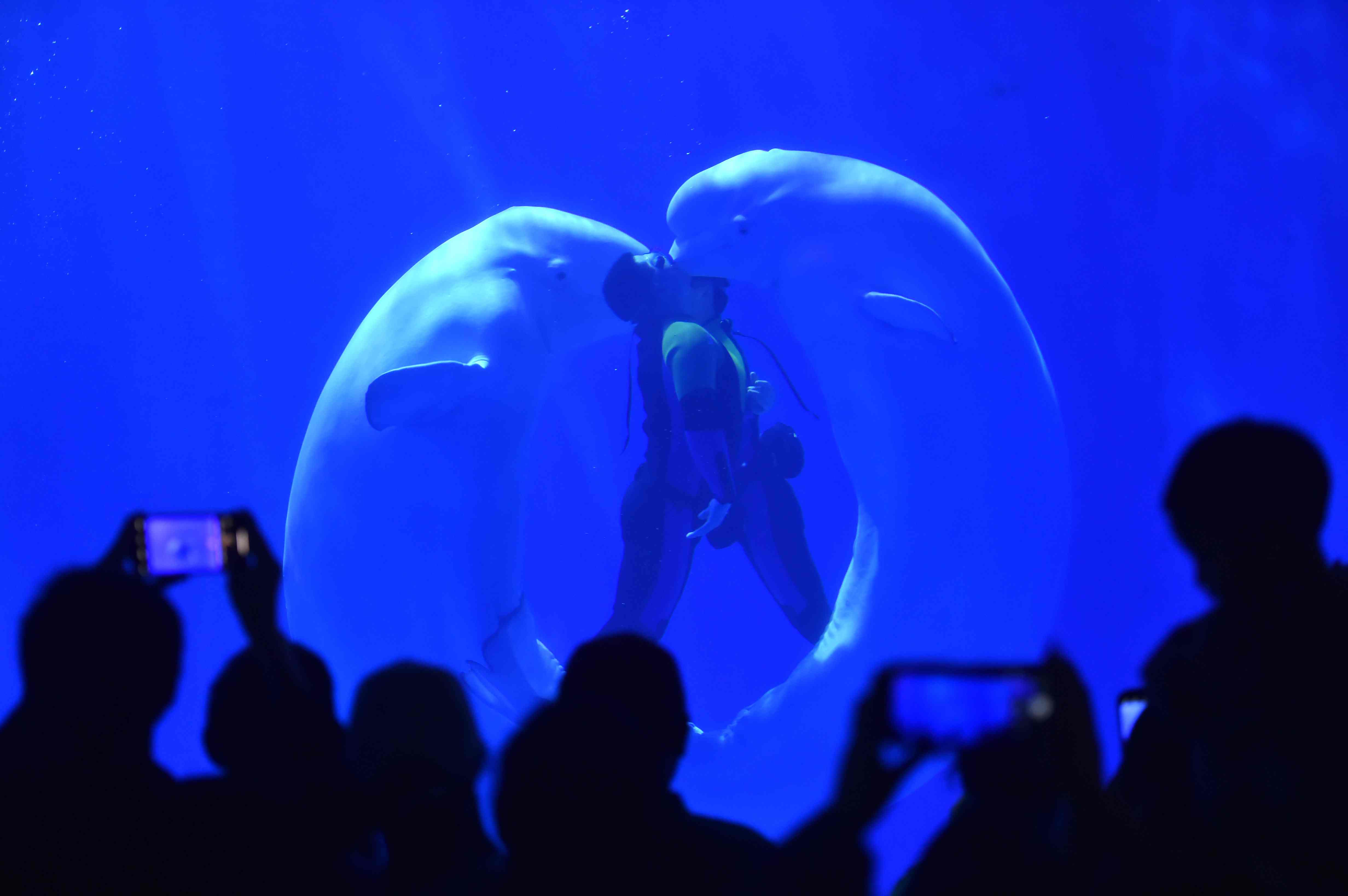 2023年4月28日,演員在貴陽(yáng)市多彩貴州城極地海洋世界表演“白鯨之吻”。