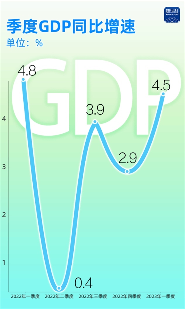 有數(shù)為證:2022年至今,我國(guó)的季度GDP同比增速分別為4.8%、0.4%、3.9%、2.9%和4.5%,一季度GDP增速達(dá)到了2022年二季度以來最高水平。