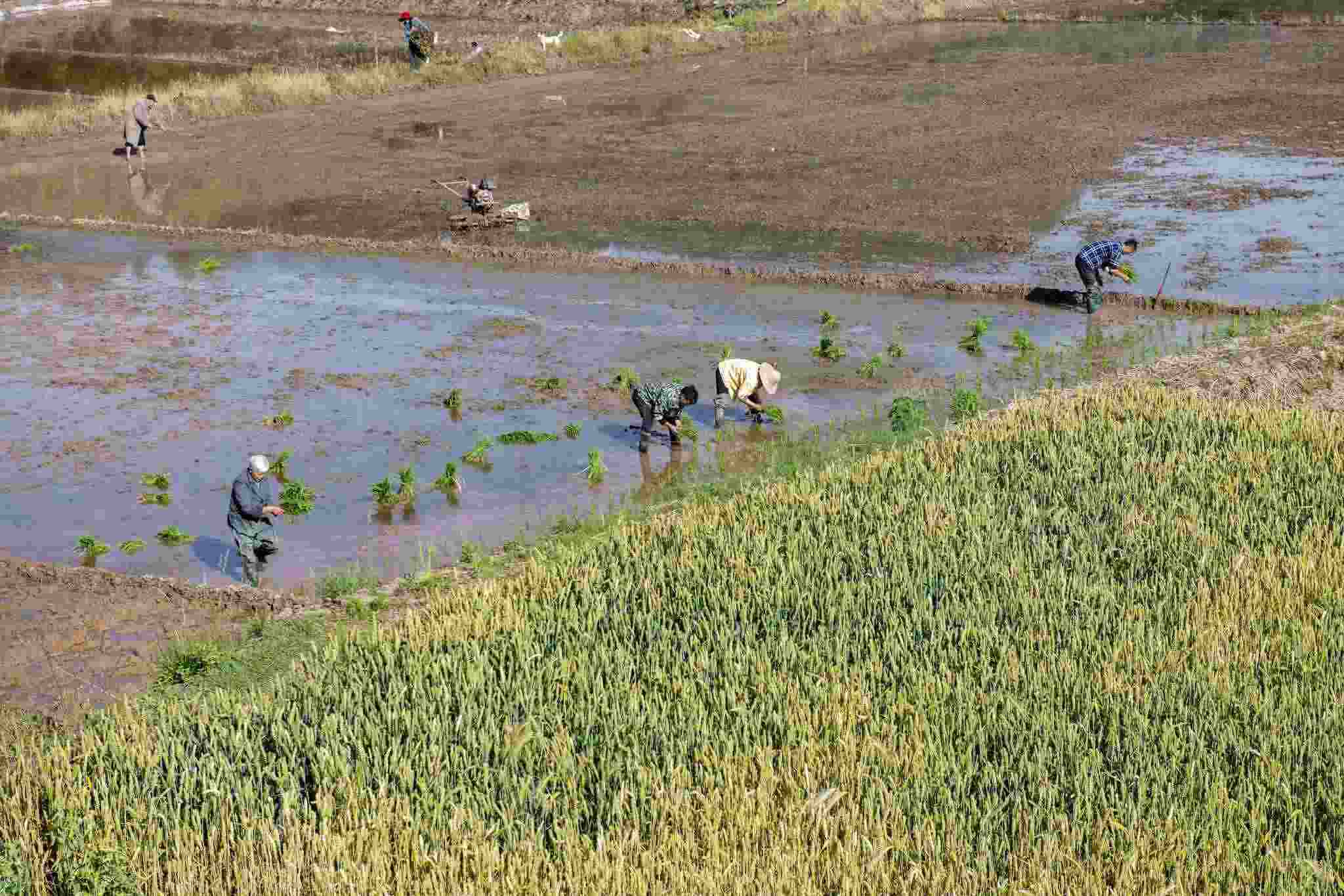 2023年4月30日,四川閬中,暮春時(shí)節(jié),村民在囤水田栽插早稻,處處可見搶抓農(nóng)時(shí)的忙碌身影。視覺中國(guó)