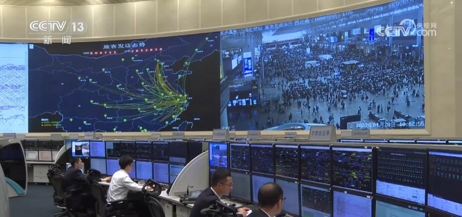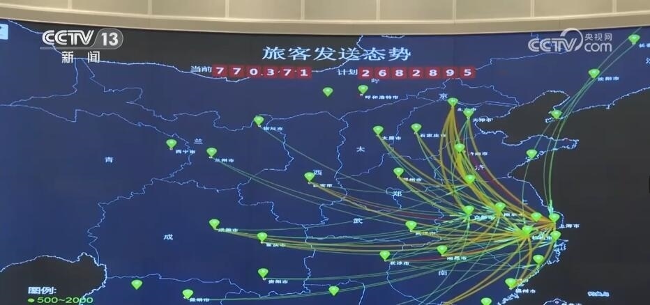 總臺(tái)央視記者 鄭連凱:在調(diào)度大廳的屏幕上,我們可以實(shí)時(shí)看到包括剛剛采訪的虹橋站在內(nèi),整個(gè)長三角地區(qū)740多座車站的客流情況,以及13000多公里鐵路線上列車的運(yùn)行狀態(tài)。而這張圖顯示的是從長三角連通全國各地的干線鐵路的繁忙程度,其中紅色的京滬、滬漢榮、滬昆代表著最繁忙,這里的工作人員可以根據(jù)客票需求隨時(shí)調(diào)度,增開臨客列車。