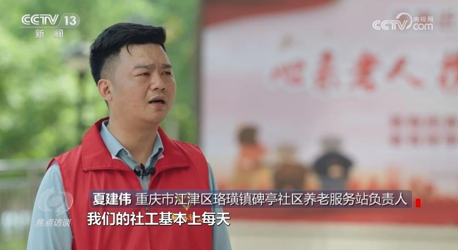 重慶市江津區(qū)珞璜鎮(zhèn)碑亭社區(qū)養(yǎng)老服務(wù)站負(fù)責(zé)人夏建偉:“一天下來,滿滿當(dāng)當(dāng)?shù)模覀兊纳绻せ旧厦刻於汲^了兩萬三千步的樣子。雖然說很累,但是每一個(gè)社工都很愉快,都覺得在這個(gè)過程當(dāng)中找到了快樂,也找到了成就感?!?/p>
