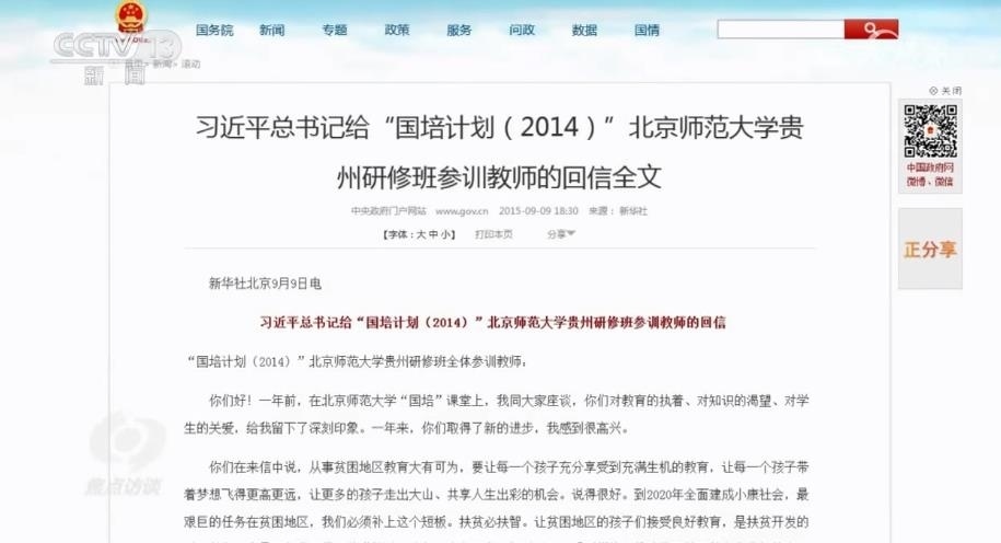 2015年8月,黃俊瓊和一起參加“國培計劃(2014)”北京師范大學(xué)貴州研修班的其他教師給習(xí)近平總書記寫了一封信,匯報他們一年來的工作。很快,習(xí)近平總書記給他們回信了,在信中,總書記勉勵他們,努力做教育改革的奮進者、教育扶貧的先行者、學(xué)生成長的引導(dǎo)者,為貧困地區(qū)教育事業(yè)發(fā)展、為祖國下一代健康成長繼續(xù)作出自己的貢獻。