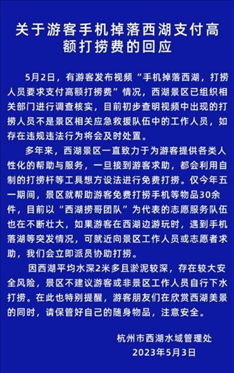 ·西湖景區(qū)回應(yīng)高價撈手機(jī):非工作人員,接到求助會免費打撈。
