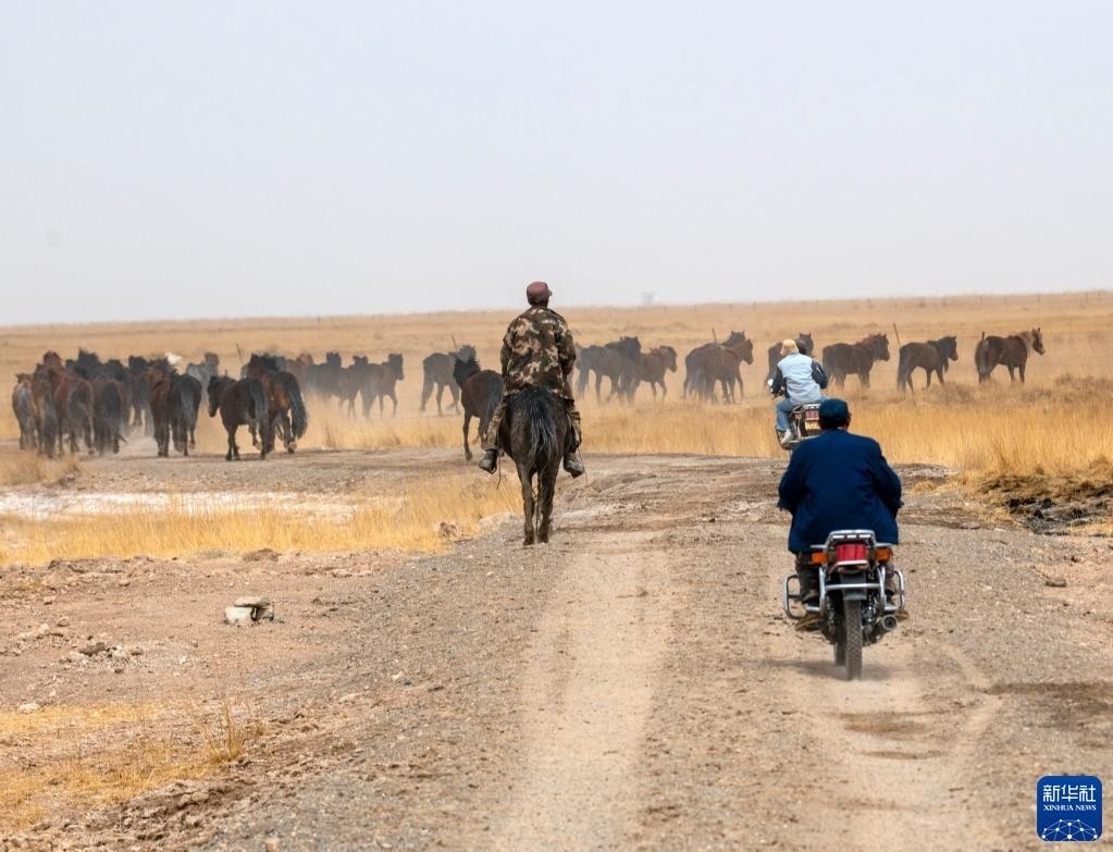 5月3日,在阿克塞縣阿伊納鄉(xiāng)海子草原,牧民趕著馬群進行轉場。   新華社發(fā)(高宏善 攝)