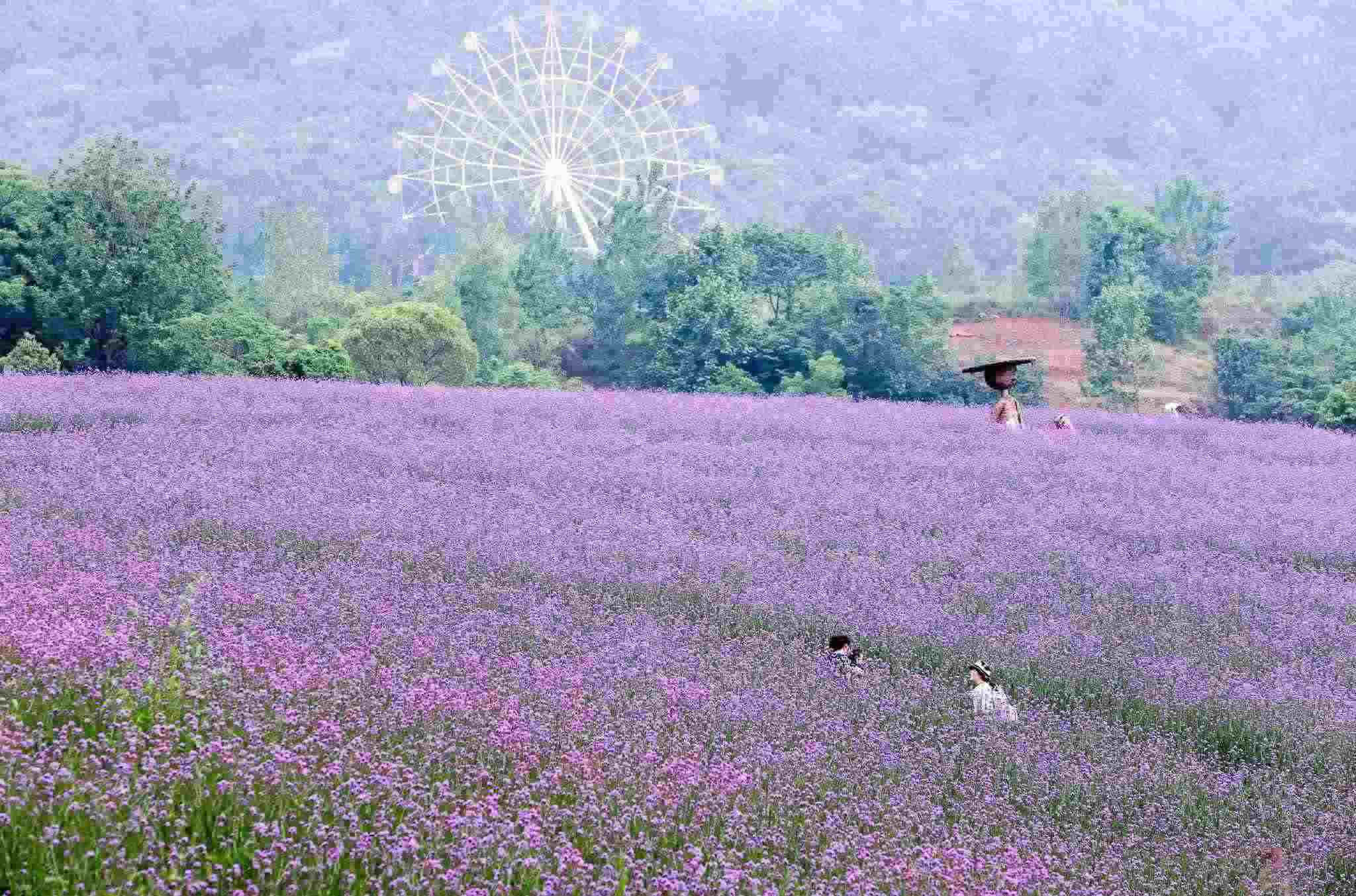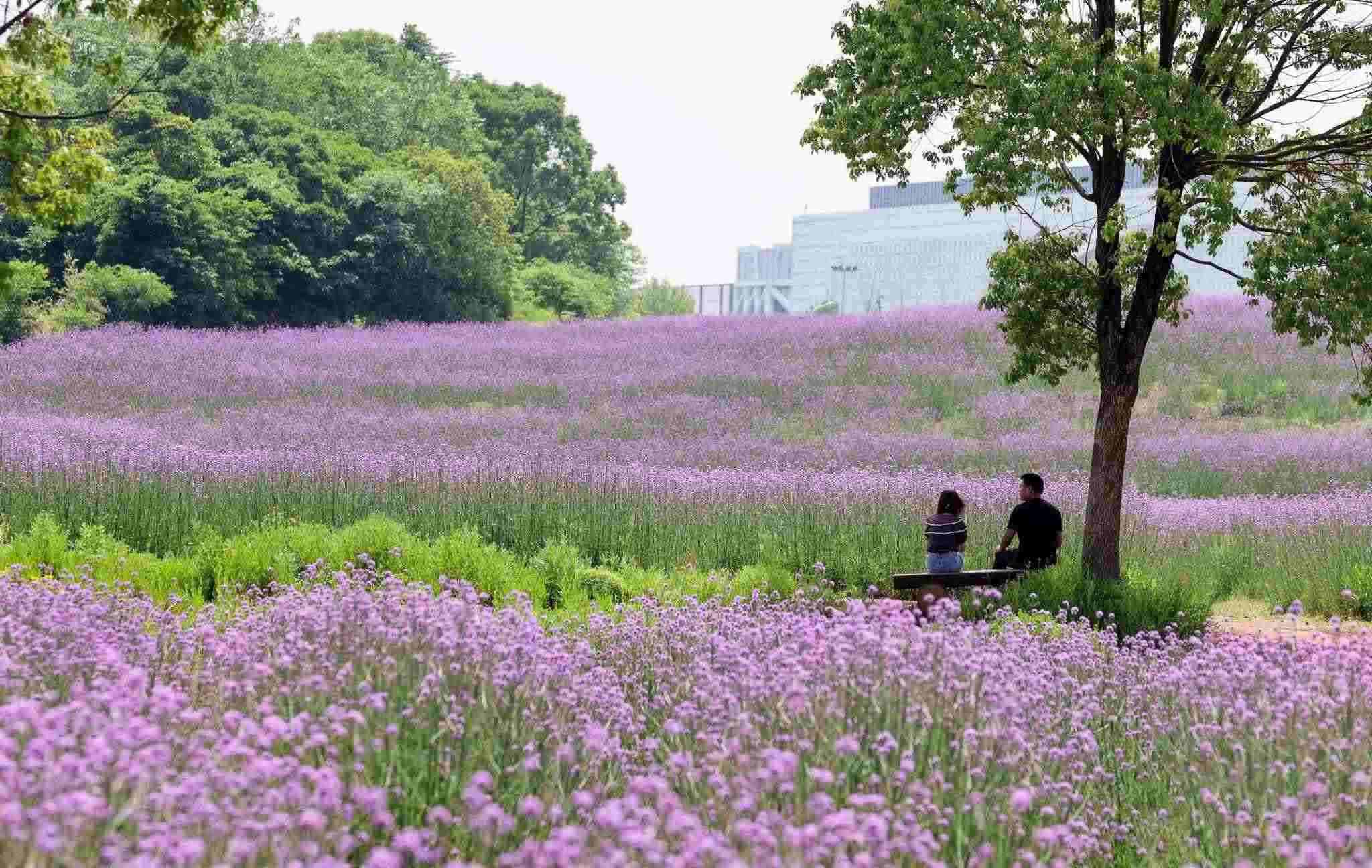 武漢:馬鞭草盛放 游人花海間拍照
