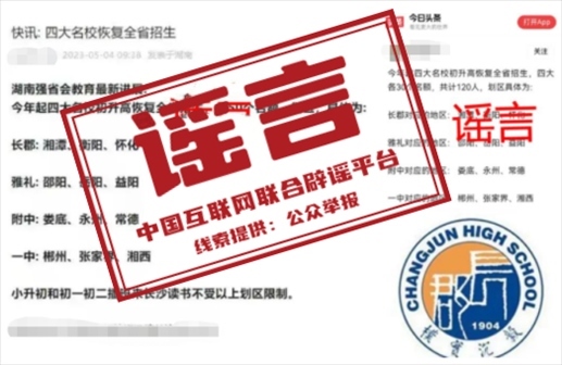 真相:近日,一些網(wǎng)站和自媒體平臺發(fā)布“今年起,長郡中學、雅禮中學、湖南師大附中、長沙市一中等長沙‘四大名?!跎呋謴腿≌猩钡男畔⒁l(fā)關注。5月4日,湖南省教育廳對此發(fā)布聲明稱,此消息為不實消息。湖南省自2021年全面規(guī)范普通高中招生,禁止跨區(qū)域招生,并對違規(guī)招生行為進行嚴肅查處。請大家不信謠不傳謠。(來源:湖南省教育廳微信公眾號)