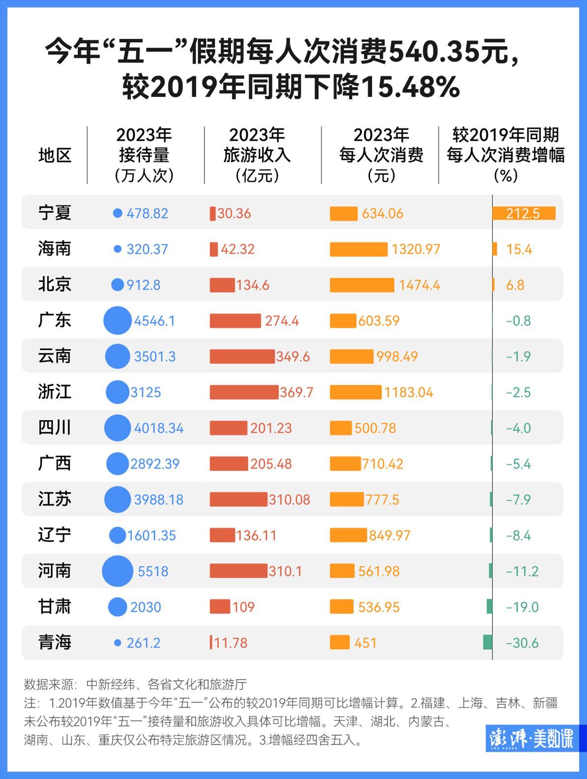 然而,人流井噴的背后,消費(fèi)卻暫未回歸。以文旅部公布的數(shù)據(jù)進(jìn)行計(jì)算,今年“五一”假期每人次消費(fèi)540.35元,較2019年同期下降15.48%。澎湃新聞?dòng)浾哌€統(tǒng)計(jì)了各省的“五一”消費(fèi)成績單,發(fā)現(xiàn)大部分省市的每人次消費(fèi),較2019年同期皆有所下降。