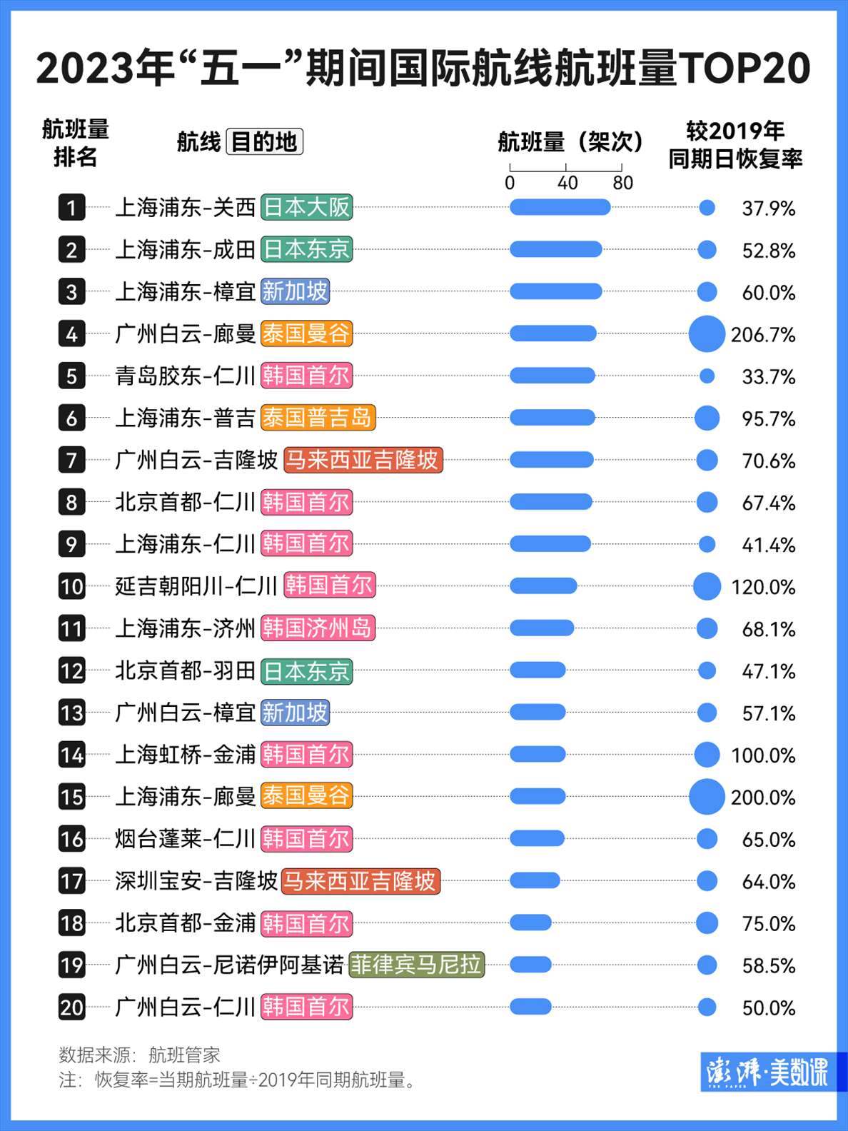 具體來看,今年“五一”期間航班量TOP20國際航線中,飛往泰國曼谷的“廣州白云-廊曼”和“上海浦東-廊曼”航班量已遠(yuǎn)超2019年同期水平,增幅超過100%。