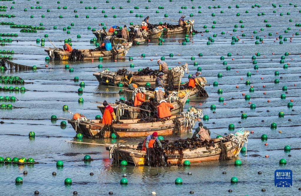 5月8日,在山東省榮成市愛倫灣海域海帶養(yǎng)殖區(qū),漁民采收海帶(無人機(jī)照片)。