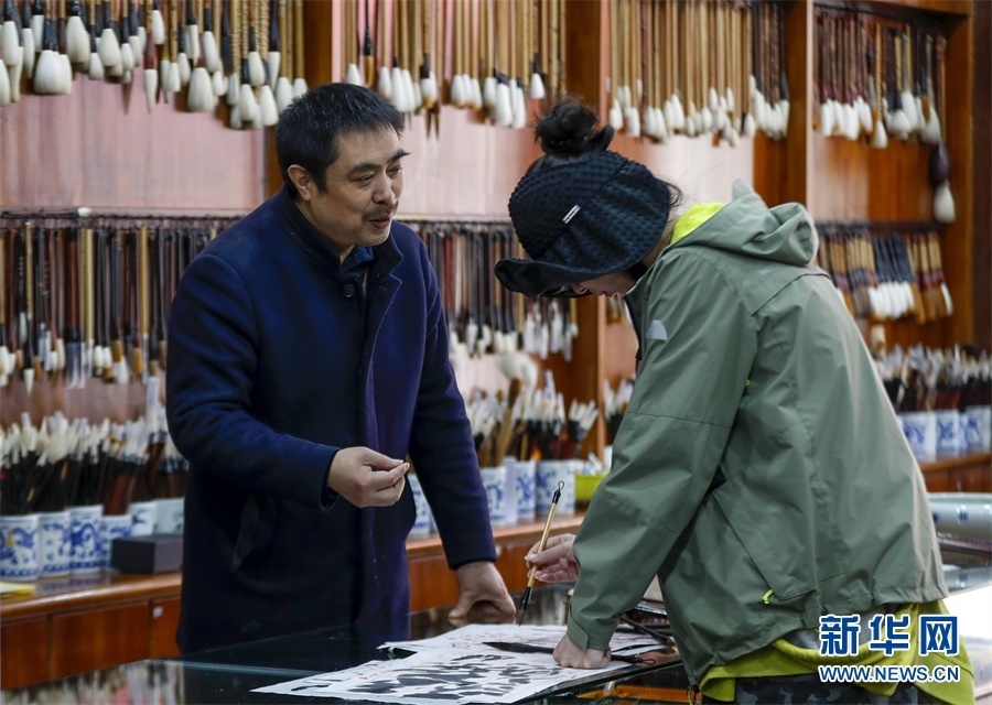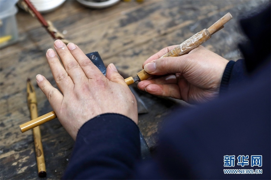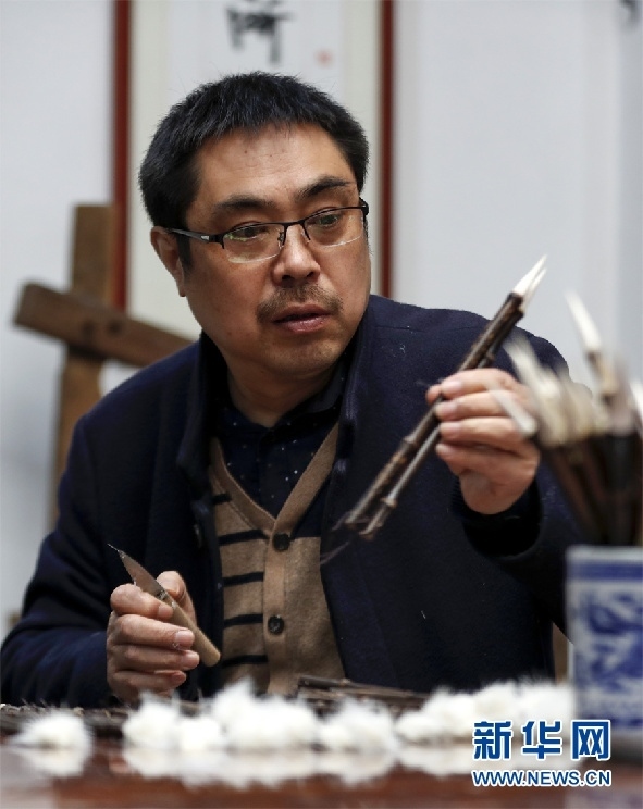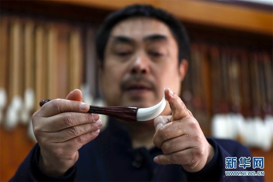 一支好的徽筆,不僅要保留傳統(tǒng)工藝,且要在原基礎(chǔ)上不斷創(chuàng)新、改良。楊文尤其重視書(shū)畫(huà)家對(duì)筆的使用反饋:“因?yàn)樗麄儗?duì)用筆最挑剔,而且現(xiàn)代書(shū)畫(huà)家創(chuàng)作方式和作品不斷創(chuàng)新,對(duì)毛筆也有新的要求,他們提出的要求我總是盡力去滿(mǎn)足,也使得制筆技藝進(jìn)一步得到了提高?!? 新華網(wǎng)發(fā)(施亞磊 攝)