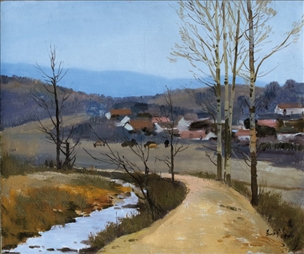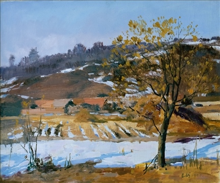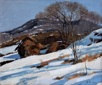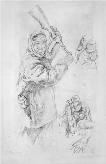 《激戰(zhàn)松骨峰》描繪的是抗美援朝戰(zhàn)爭中,中國人民志愿軍與美軍激烈廝殺的悲壯場面。作者從動態(tài)型的構圖與形象表層,把戰(zhàn)爭集團之間的搏殺以濃重的筆調(diào)展現(xiàn)開來,表現(xiàn)了中國人民志愿軍英勇頑強、熱愛自由和勇于犧牲的精神,展示了歷史的悲劇性沖突。作者從沉甸甸的歷史中找到戰(zhàn)爭中最慘烈、最殘酷、最能表現(xiàn)人物悲劇性命運的瞬間,用現(xiàn)實主義的創(chuàng)作手法,扎實、生動地塑造了一個又一個志愿軍勇士的形象。硝煙籠罩著戰(zhàn)場,鮮血與白雪融合成冰,敵我雙方,犬牙交錯,生死搏殺。同時,也使我們感受到戰(zhàn)爭的殘酷與生命的脆弱。作者處理宏大的戰(zhàn)爭場面獨具匠心:陽光透過硝煙,有節(jié)奏地營造出戰(zhàn)場的空間;雪地上被間隔的藍色陰影,反襯出黃褐色的主調(diào)。作品對細部進行了恰如其分的刻畫,但又不失對整體宏觀的把握,厚重的色彩中透出熱情,樸拙的筆觸映著畫家的激動。