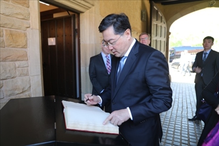 秦剛并在簽名簿上留言:維護(hù)戰(zhàn)后國際秩序、促進(jìn)世界和平繁榮、實現(xiàn)中國國家統(tǒng)一。