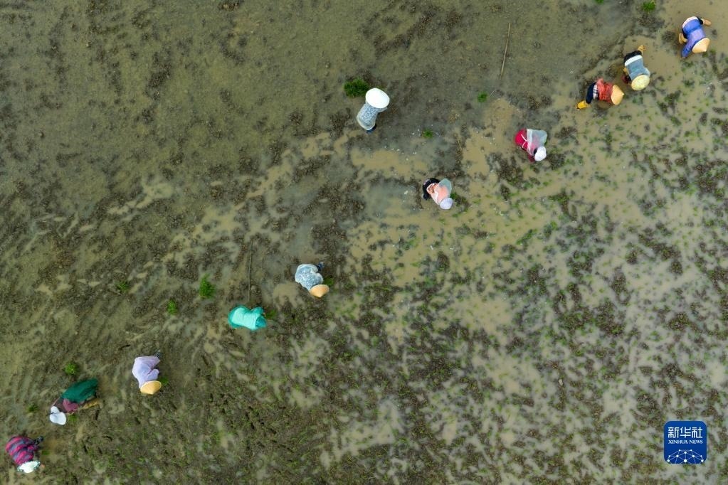 5月9日,在四川省崇州市道明鎮(zhèn)協(xié)和社區(qū),農(nóng)民向一片高標(biāo)準(zhǔn)農(nóng)田里拋水稻秧苗,以方便其他農(nóng)民插秧。