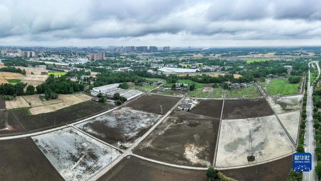 5月10日,在四川省崇州市天府糧倉國家現(xiàn)代農(nóng)業(yè)園區(qū),農(nóng)民駕駛農(nóng)機(jī)搶種水稻(無人機(jī)照片)。