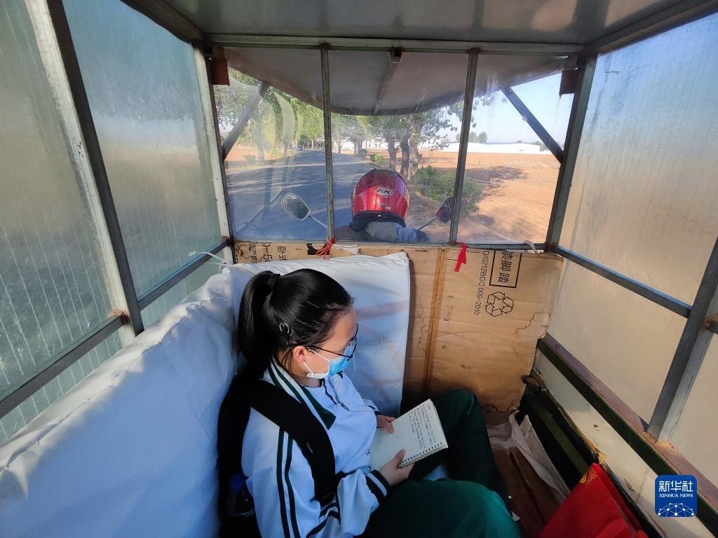 清晨,張連琴騎著電動三輪車拉著女兒李昕偉去上學(xué),女兒在車棚內(nèi)背誦詩詞(5月8日手機拍攝)。