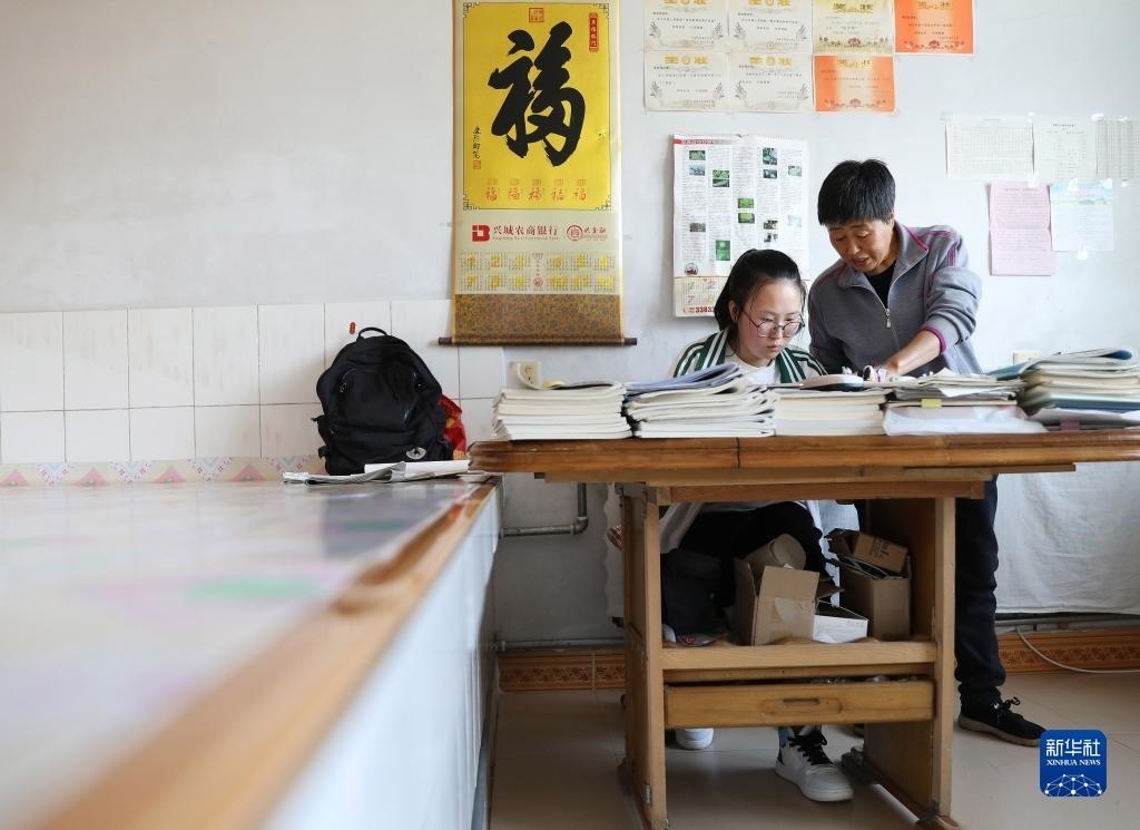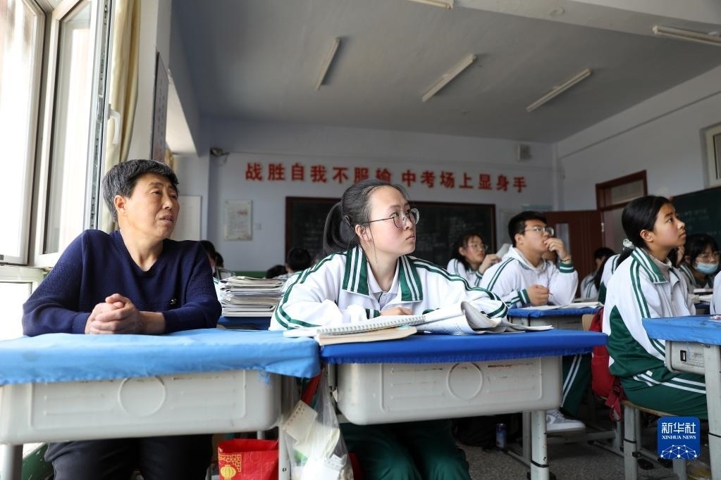 張連琴(左下)和女兒李昕偉在教室內(nèi)聽課(5月8日攝)。