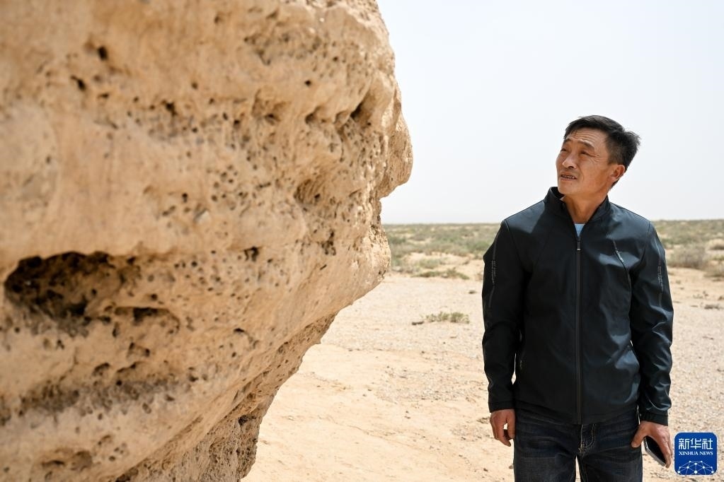 5月13日,駝峰(長(zhǎng)城)文物保護(hù)隊(duì)員布音烏力吉在觀察阿拉善左旗一處烽火臺(tái)遺址表面,查看是否有人為破壞痕跡。