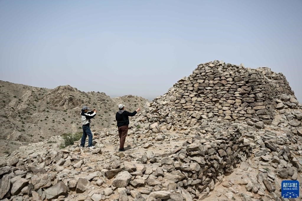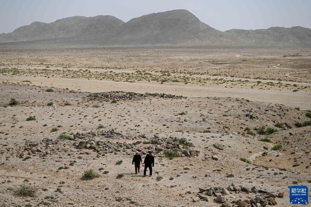 5月13日,駝峰(長(zhǎng)城)文物保護(hù)隊(duì)員許繼龍(右)和烏仁其其格在巡查阿拉善左旗一處石圈遺址。