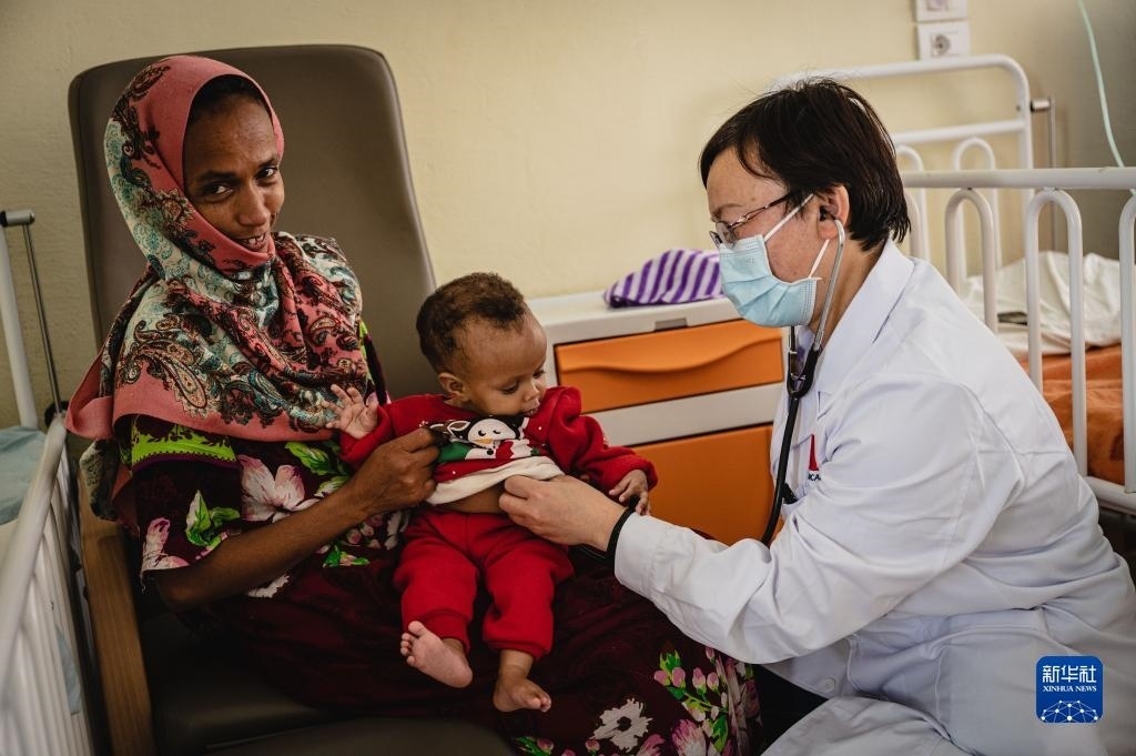 5月9日,在厄立特里亞首都阿斯馬拉的奧羅特醫(yī)院,醫(yī)療隊(duì)兒科醫(yī)生張春燕(右)為小朋友聽診。