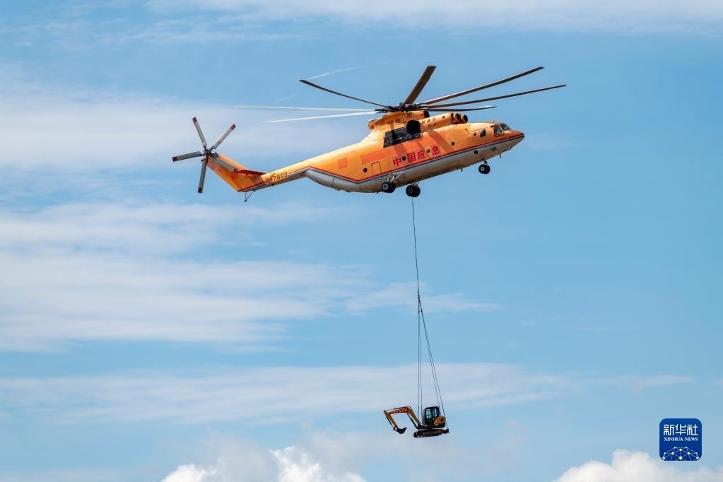 5月16日,一架參演直升機在麗江演習現(xiàn)場上空轉(zhuǎn)運一臺挖掘機。