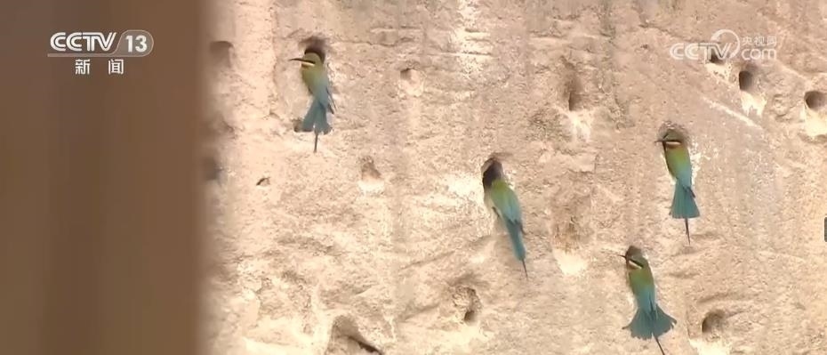 眼前,這些看上去很像是泥巴墻的建筑,其實是人工建造的候鳥巢穴。根據(jù)栗喉蜂虎的生活習(xí)慣,保護(hù)區(qū)工作人員專門在它們回來之前就對懸壁進(jìn)行修整,讓這些美麗的小鳥更方便安家。