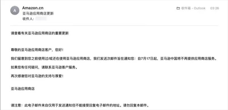 ·亞馬遜應(yīng)用商店發(fā)送郵件提醒稱(chēng),自7月17日起亞馬遜中國(guó)將不再提供應(yīng)用商店服務(wù)。
