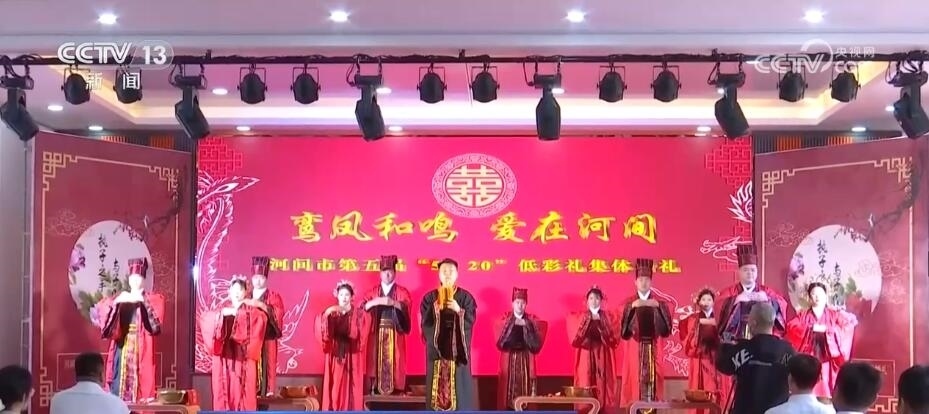 在江西貴溪、山東巨野等地,五月份組織了多場主題為“不要彩禮要幸福”的集體婚禮,倡導新人們選擇簡約的婚禮儀式。在河北省河間市的集體婚禮現(xiàn)場,紅毯艷艷、絲竹裊裊,新人們身著傳統(tǒng)禮服,在證婚人、主婚人的見證下,按照周制漢婚的傳統(tǒng)儀式開啟他們愛的旅程。
