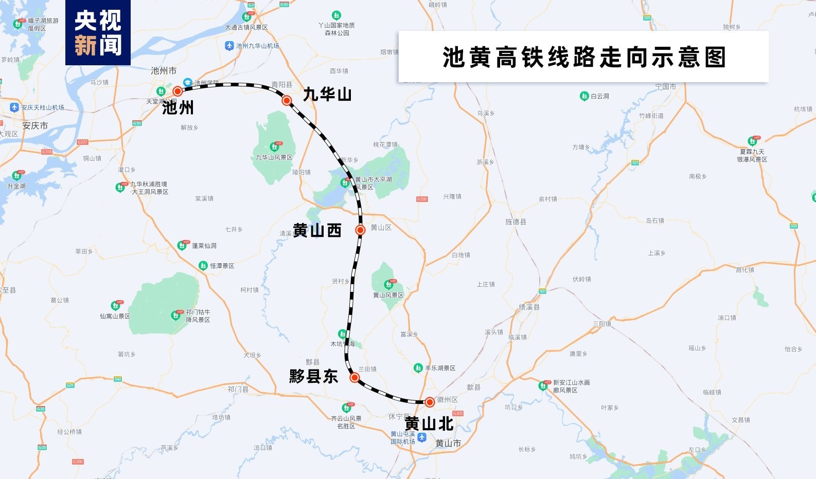 池黃高鐵是武漢至杭州高速鐵路通道的重要組成部分,線路起自池州站,至黟縣東站與在建昌景黃高鐵共站并線至黃山北站,新建正線長約125公里,設計時速350公里,全線隧道34座,隧道占比60.8%,總投資額183.7億元,全線設池州、九華山、黃山西、黟縣東、黃山北等5座車站。池黃高鐵通車后,將成為串聯(lián)起黃山、九華山的黃金旅游線路。