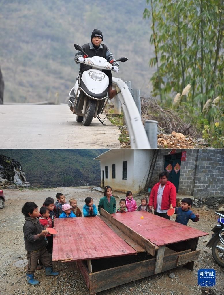 拼版照片:上圖為2023年1月26日,在大化瑤族自治縣板升鄉(xiāng)弄勇村,在廣東工作、返鄉(xiāng)過年的蒙宣海在路邊休息;下圖為2012年12月27日,在弄勇村弄頂教學(xué)點(diǎn),7歲的蒙宣海(右一)在打乒乓球。2022年,蒙宣海技校畢業(yè)后,選擇去廣東工作。