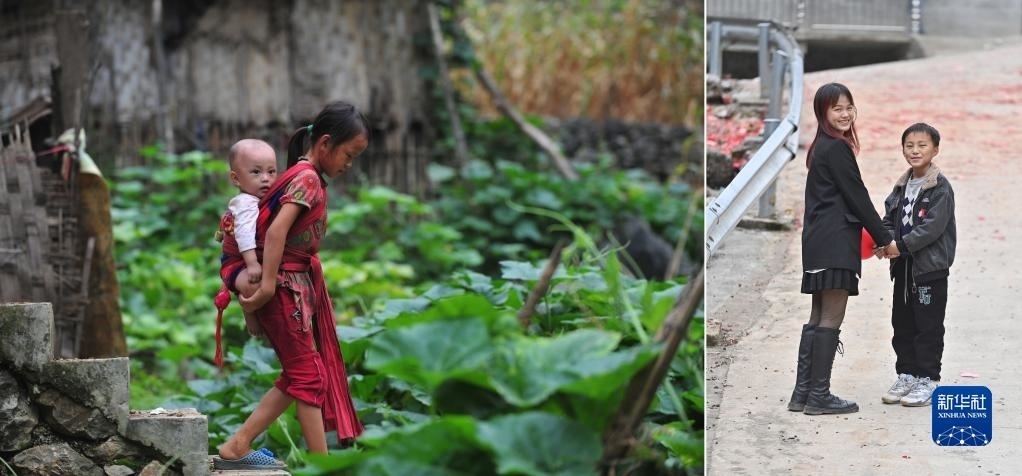 拼版照片:左圖為2012年7月16日,在大化瑤族自治縣板升鄉(xiāng)弄勇村,4歲的蒙宣宏(左)穿著姐姐的舊衣服和同為4歲的藍(lán)小帥在一起玩耍;右圖為2023年1月21日,在大化瑤族自治縣板升鄉(xiāng)弄勇村,蒙宣宏(左)和藍(lán)小帥合影。蒙宣宏和藍(lán)小帥目前分別在板升鄉(xiāng)和大化縣城讀初二。