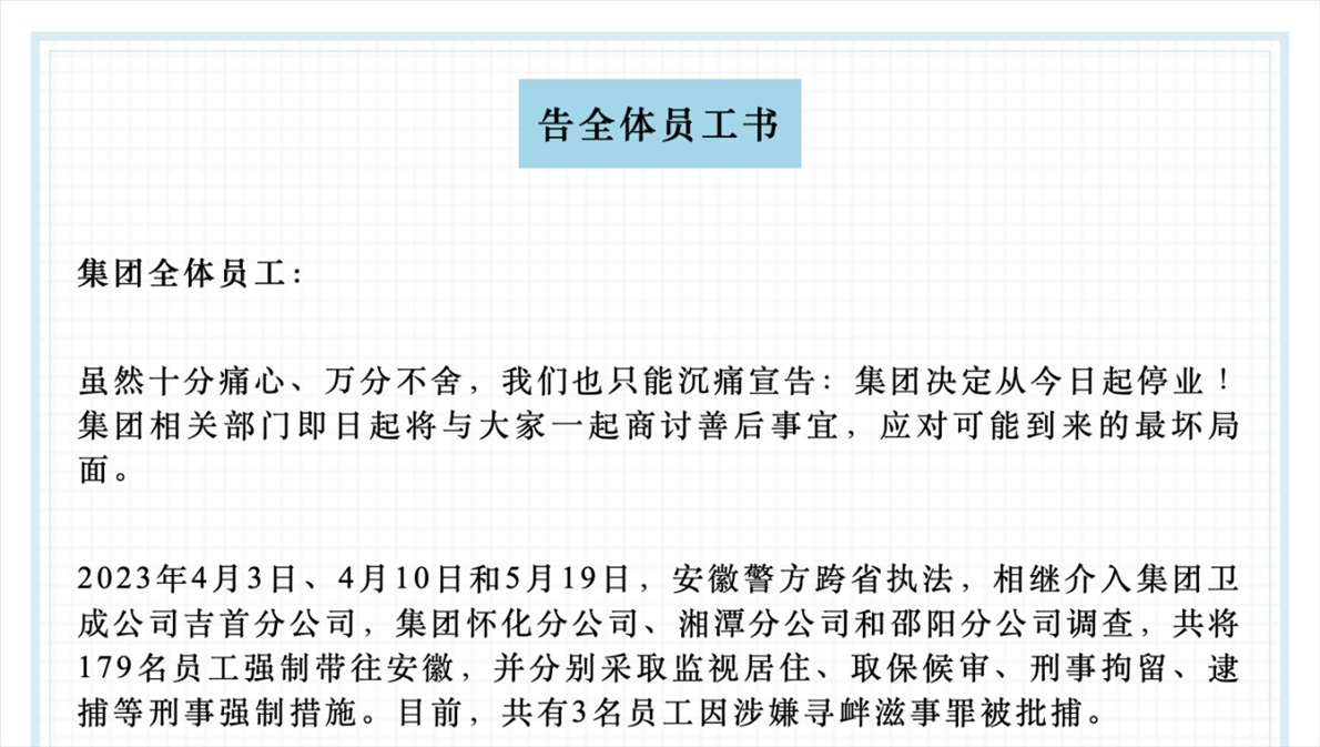 ·“催收巨頭”湖南永雄發(fā)布停業(yè)消息后又撤回,自稱179名員工被采取刑事強制措施。警方回應:該案件正在進一步偵辦中。