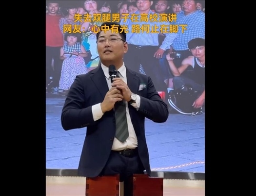 近日,山東臨沂,失去雙腿的男子在高校演講。據(jù)悉,該男子名叫陳州,是世界上第一個用雙手登頂五岳的人。網(wǎng)友:心中有光,路何止在腳下。