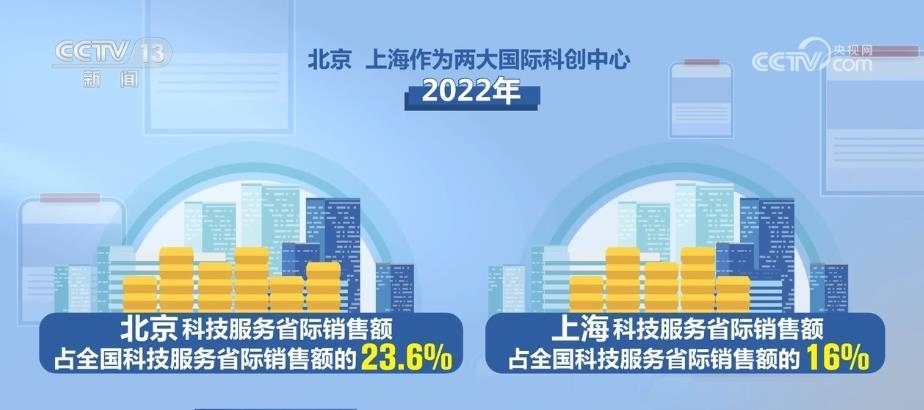 從創(chuàng)新來看,2017年—2022年,全國科技服務(wù)省際銷售額年均增長28%,較科技服務(wù)總體銷售收入增速快4.2個百分點(diǎn)。今年截至5月20日,科技服務(wù)省際銷售額同比增長29.7%,較科技服務(wù)總體銷售收入增速快2.6個百分點(diǎn)。北京、上海作為兩大國際科創(chuàng)中心,2022年科技服務(wù)省際銷售額分別占全國科技服務(wù)省際銷售額的23.6%和16%;2017年—2022年年均分別增長22.1%和24.2%。