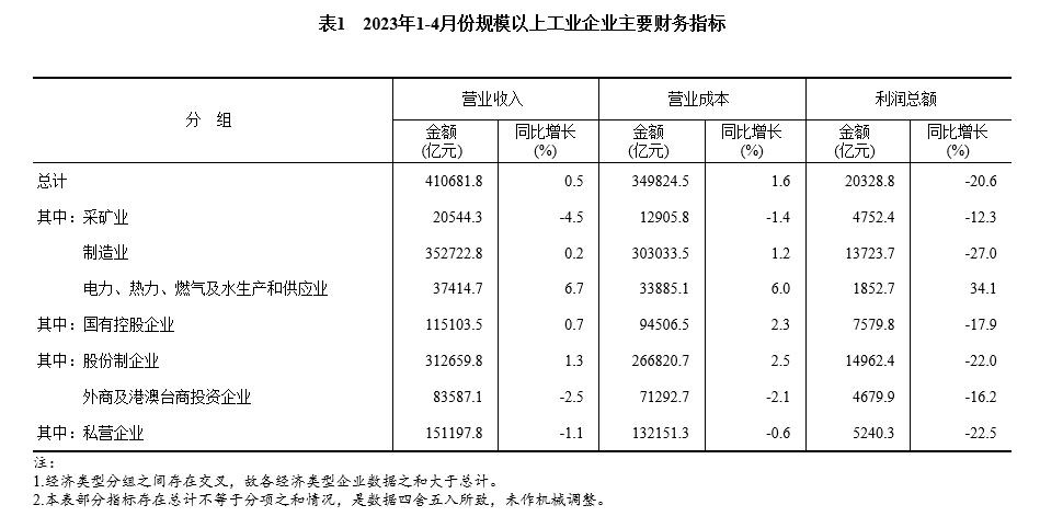 1—4月份,規(guī)模以上工業(yè)企業(yè)中,國(guó)有控股企業(yè)實(shí)現(xiàn)利潤(rùn)總額7579.8億元,同比下降17.9%;股份制企業(yè)實(shí)現(xiàn)利潤(rùn)總額14962.4億元,下降22.0%;外商及港澳臺(tái)商投資企業(yè)實(shí)現(xiàn)利潤(rùn)總額4679.9億元,下降16.2%;私營(yíng)企業(yè)實(shí)現(xiàn)利潤(rùn)總額5240.3億元,下降22.5%。