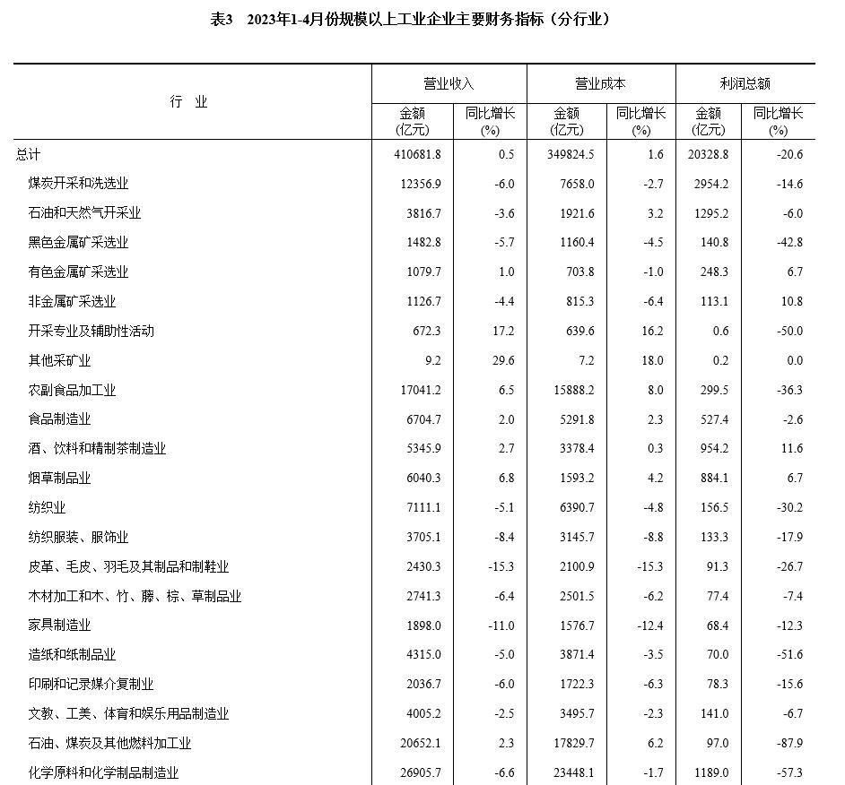 1—4月份,采礦業(yè)實(shí)現(xiàn)利潤(rùn)總額4752.4億元,同比下降12.3%;制造業(yè)實(shí)現(xiàn)利潤(rùn)總額13723.7億元,下降27.0%;電力、熱力、燃?xì)饧八a(chǎn)和供應(yīng)業(yè)實(shí)現(xiàn)利潤(rùn)總額1852.7億元,增長(zhǎng)34.1%。