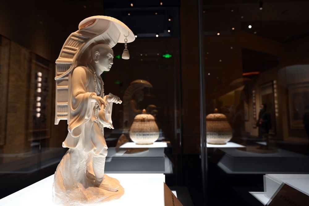 這是在北京中國(guó)國(guó)家博物館展出的德化白釉玄奘立像(2023年1月8日攝)。新華社記者 金良快 攝