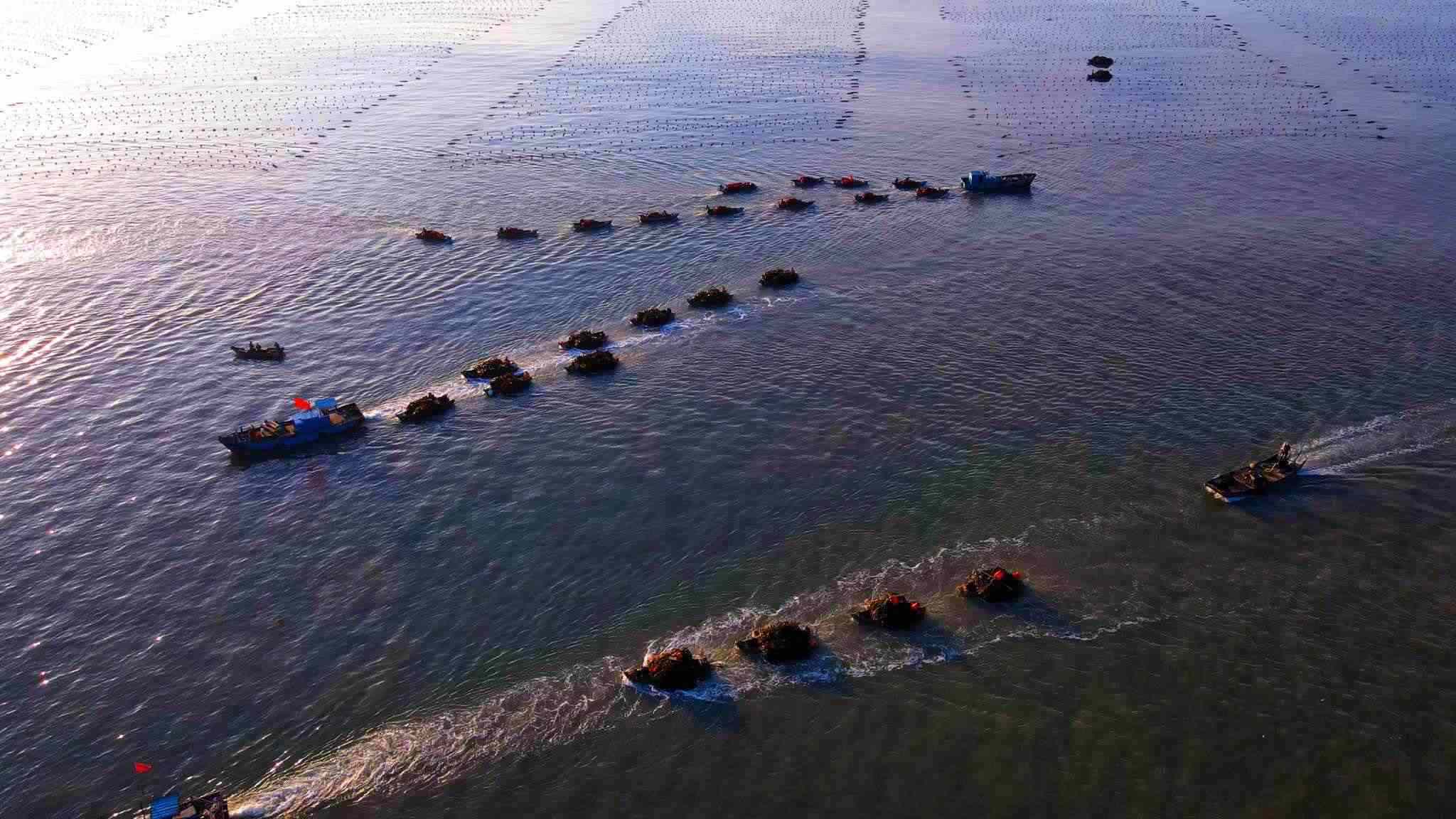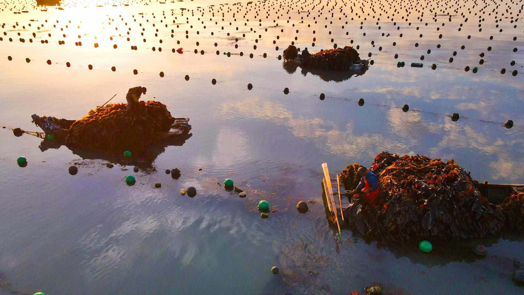 2023年5月31日,山東威海,榮成愛(ài)倫灣海洋牧場(chǎng),漁民駕駛船只在海上收獲海帶,美麗的朝霞倒影在海上,海鷗伴舞,海洋牧場(chǎng)到處呈現(xiàn)一派豐收的喜人景象。視覺(jué)中國(guó)