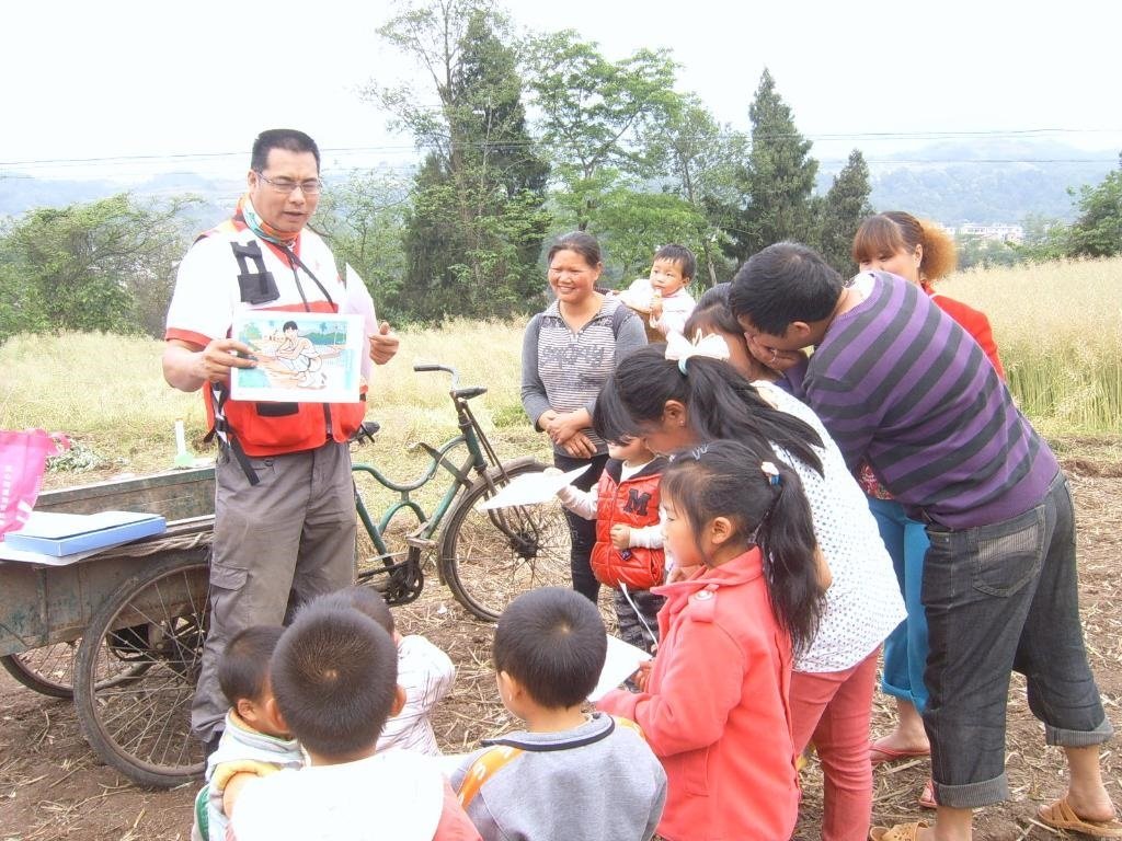 楊海龍參與四川雅安地震救援時(shí),給小朋友做衛(wèi)生宣傳。(受訪者供圖)