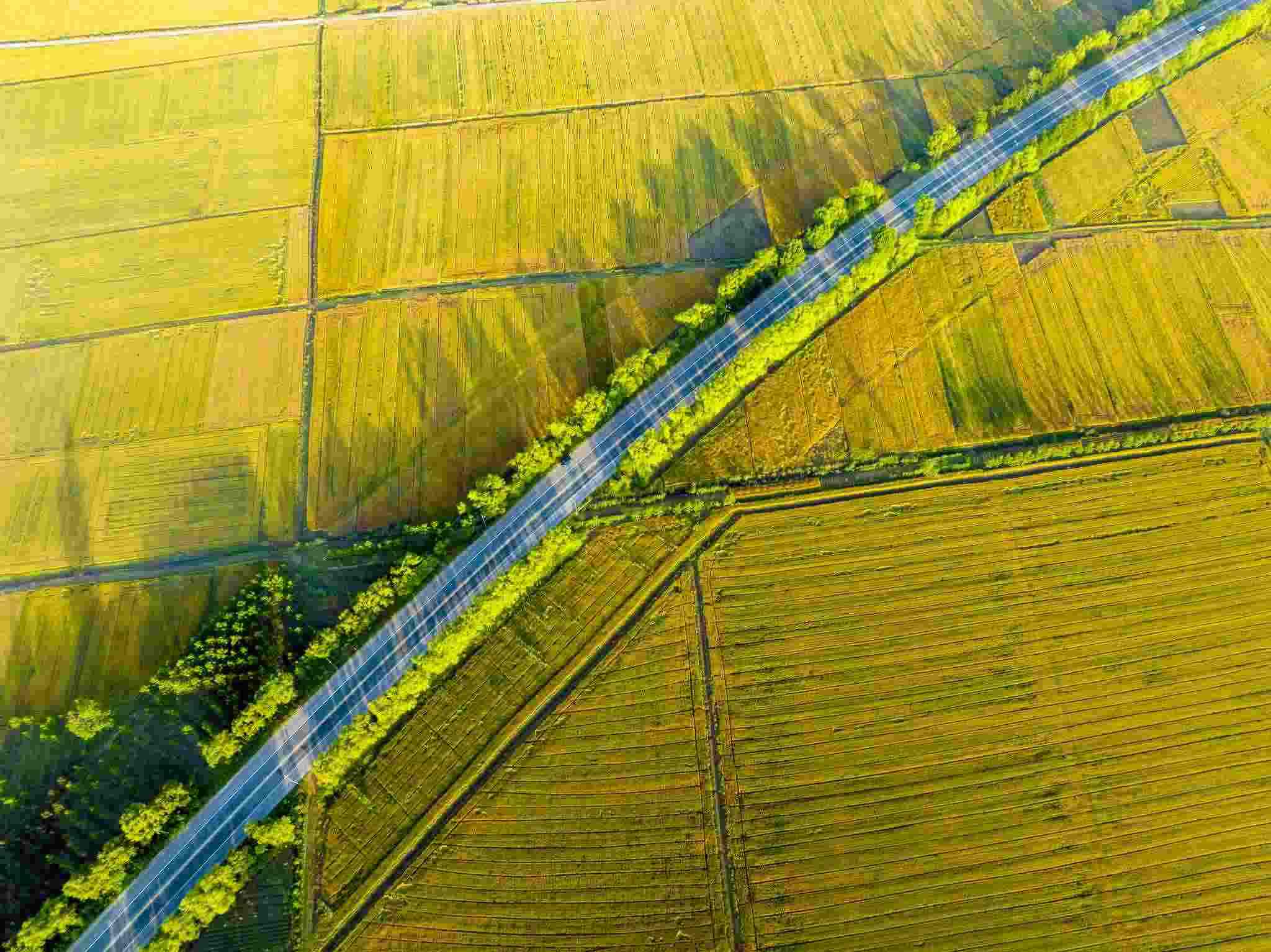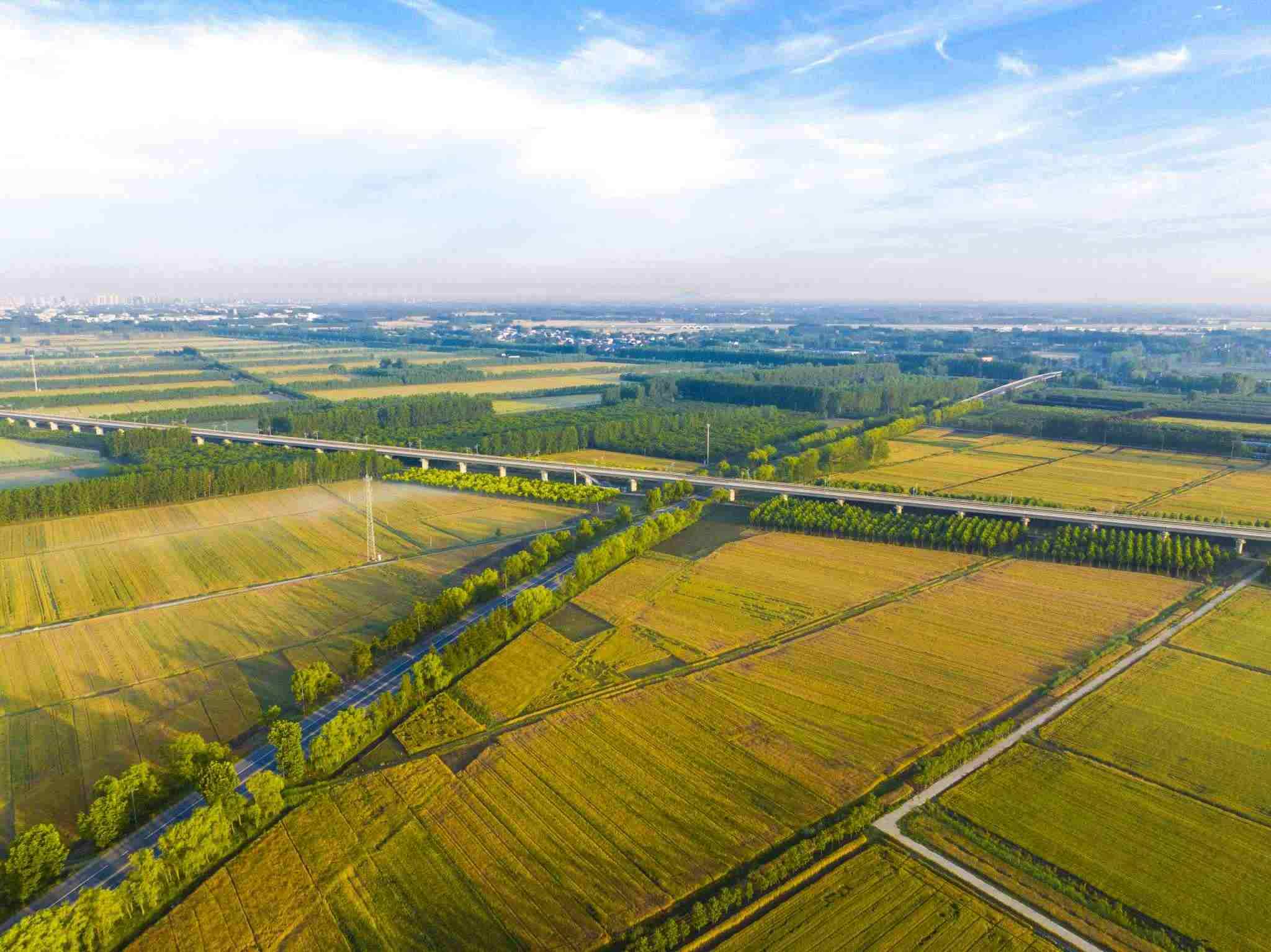2023年6月3日,江蘇連云港,東海縣,金色田野與村莊、道路、河流共同構(gòu)成了一幅秀美的夏日豐收畫卷。視覺(jué)中國(guó)
