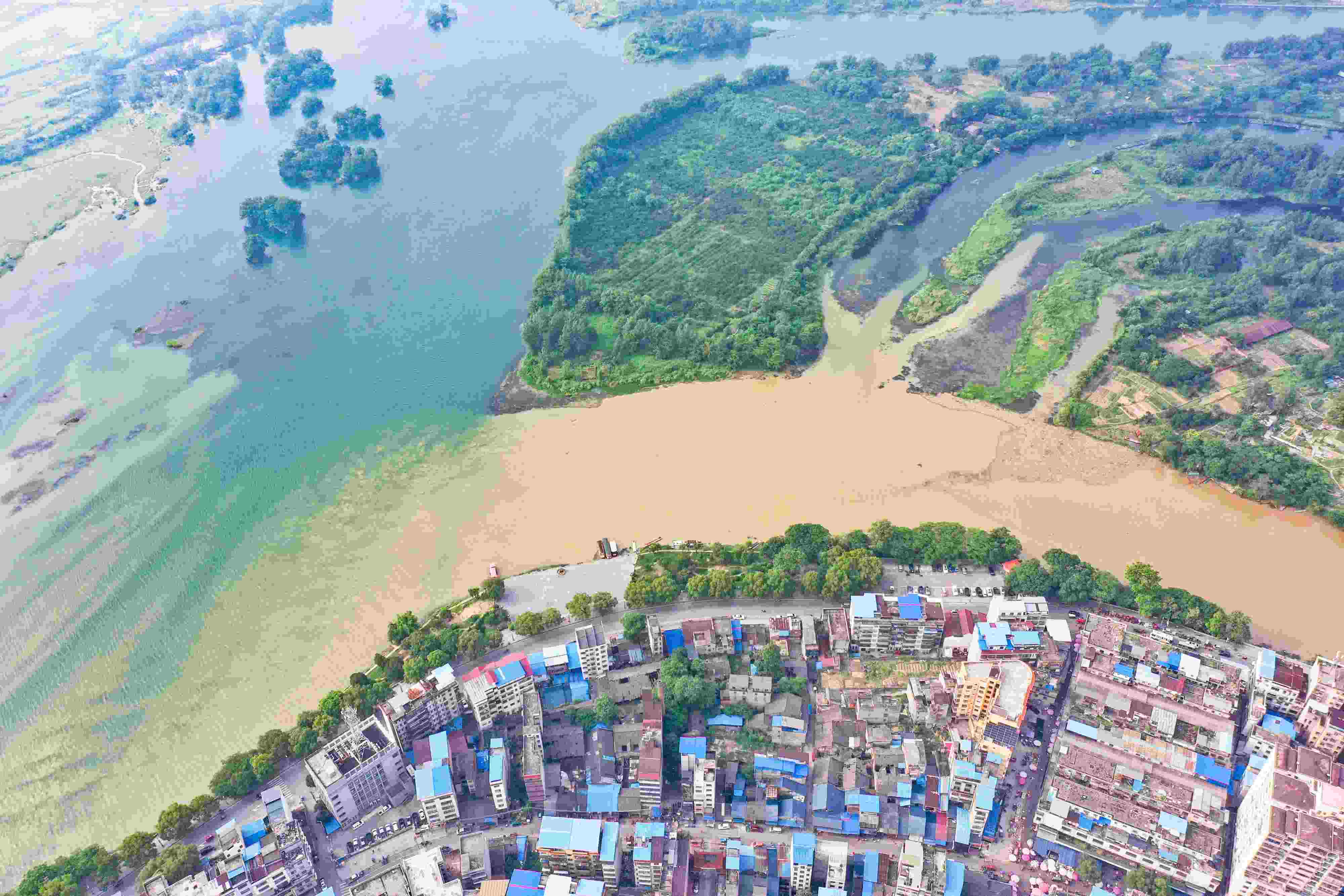 2023年6月4日,受降雨影響,廣西桂林全州縣城湘江河段出現(xiàn)涇渭分明景觀??罩懈╊?,湘江支流萬鄉(xiāng)河混濁的河水繞城匯入清澈的湘江干流,交匯之處涇渭分明。 視覺中國