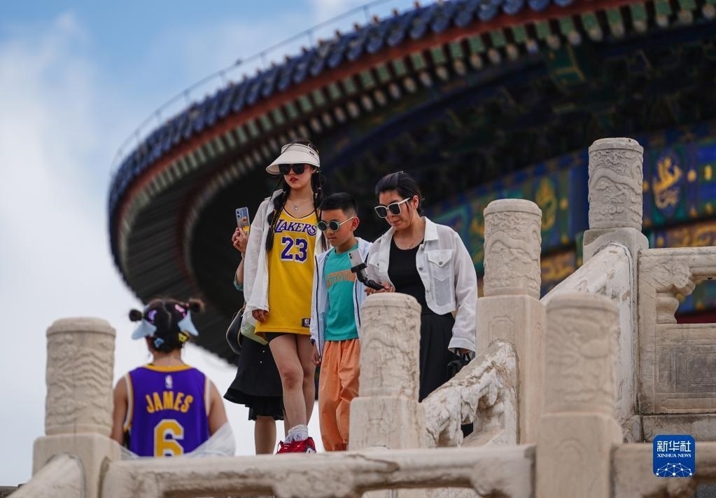 6月9日,游客在天壇祈年殿游覽。