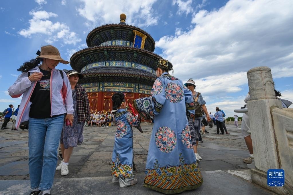 6月9日,游客在藍天白云下的天壇祈年殿游覽。