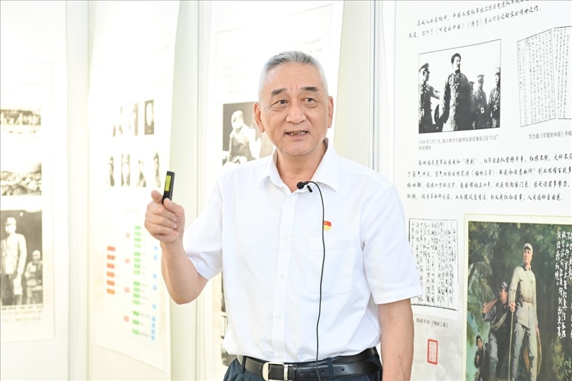 會(huì)后,領(lǐng)導(dǎo)嘉賓觀看“背負(fù)民族希望—紀(jì)念新四軍成立86周年回顧展”,張曉龍現(xiàn)場給大家講述新四軍的歷史沿革和征戰(zhàn)歷程。