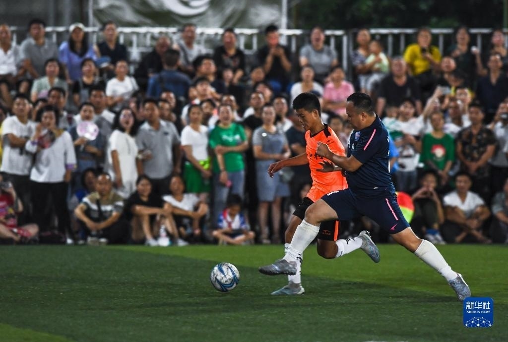 6月9日,鳳凰村足球隊(duì)與新中村足球隊(duì)在“村超”比賽中。