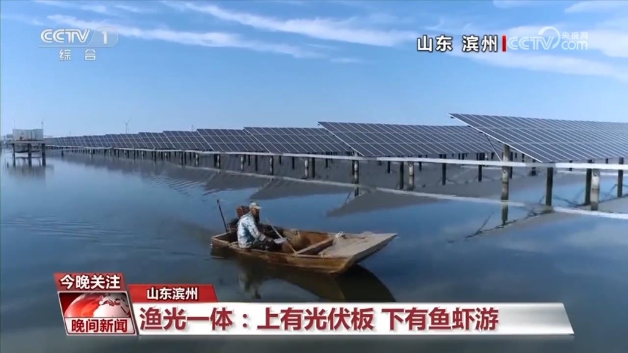 我們現(xiàn)在從陸地轉(zhuǎn)向水域,在山東濱州沾化的這個(gè)鹽田蝦養(yǎng)殖區(qū)里,蝦池上方是藍(lán)色光伏板,25度傾斜角的設(shè)計(jì),既能達(dá)到最佳發(fā)電效果,又能為蝦池遮光、降溫。光伏矩陣下,漁民撐一葉小舟為蝦苗投喂餌料。每年,2000萬(wàn)尾鹽田蝦從這里游上全國(guó)餐桌,近4億度清潔綠電并入電網(wǎng)。養(yǎng)殖業(yè)牽手新能源,奏出新時(shí)代的漁光曲。