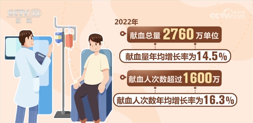 國家衛(wèi)生健康委相關(guān)負責(zé)人表示,我國無償獻血工作目前已形成了“政府主導(dǎo)、部門協(xié)作、社會支持、公眾參與”的格局,無償獻血制度全面建立,血液管理制度和規(guī)范標(biāo)準(zhǔn)體系不斷完善。全國建立了橫向到邊、縱向到底的血站采供血服務(wù)體系。全國共建設(shè)血站453家,形成以省級血液中心為龍頭、地市級中心血站為主體、中心血庫為補充的血站服務(wù)體系。我國血液安全保障水平大幅提升。全國無償獻血人次數(shù)和獻血量實現(xiàn)20多年持續(xù)增長,千人口獻血率由1998年的4.8提升至2022年11.5,2022年獻血總量2760萬單位,獻血量年均增長率為14.5%。2022年獻血人次數(shù)超過1600萬,獻血人次數(shù)年均增長率為16.3%。今年1—5月,獻血人次數(shù)和獻血量比去年同期增長7.7%和6%。