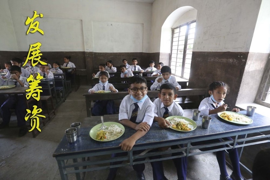 在尼泊爾加德滿都,學(xué)生們參加微笑兒童項(xiàng)目啟動(dòng)儀式并就餐(2022年7月11日攝)。由“全球發(fā)展和南南合作基金”支持的微笑兒童項(xiàng)目惠及約3600名尼泊爾學(xué)生,解決學(xué)生就餐問題。